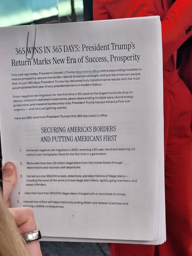 Poco prima dell’inizio della conferenza, l’ufficio stampa della Casa Bianca ha inoltre distribuito ai giornalisti un documento ufficiale intitolato “365 vittorie in 365 giorni. Il ritorno del presidente Trump segna una nuova era di successi”, che riassume e rivendica le azioni intraprese dall’amministrazione nel corso del primo anno del secondo mandato. Una copia del voluminoso dossier è stata consegnata a ciascun cronista, dando subito il tono celebrativo dell’incontro con la stampa.