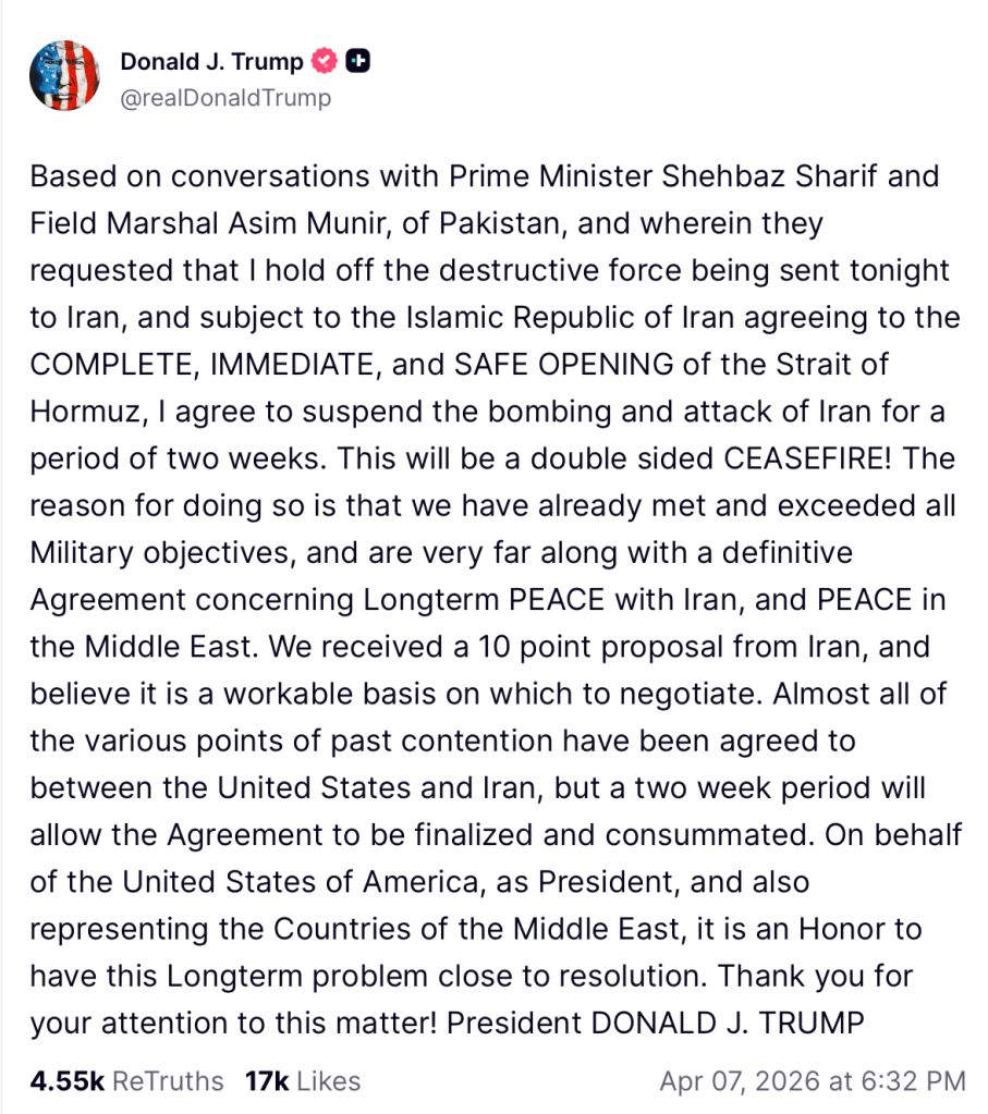 Di seguito la traduzione integrale del messaggio pubblicato su Truth dal presidente Donald Trump: “Sulla base delle conversazioni avute con il Primo Ministro Shehbaz Sharif e il Maresciallo di Campo Asim Munir del Pakistan, e nelle quali mi è stato chiesto di sospendere l’invio di forze distruttive in Iran previsto per questa sera, e a condizione che la Repubblica Islamica dell’Iran acconsenta all’APERTURA COMPLETA, IMMEDIATA e SICURA dello Stretto di Hormuz, acconsento a sospendere i bombardamenti e gli attacchi contro l’Iran per un periodo di due settimane. Si tratterà di un CESSATE IL FUOCO bilaterale! Il motivo di questa decisione è che abbiamo già raggiunto e superato tutti gli obiettivi militari e siamo a buon punto con un accordo definitivo riguardante la PACE a lungo termine con l’Iran e la PACE in Medio Oriente. Abbiamo ricevuto una proposta in 10 punti dall’Iran e riteniamo che sia una base praticabile su cui negoziare. Quasi tutti i vari punti di controversia passati sono stati concordati tra gli Stati Uniti e l’Iran, ma un periodo di due settimane consentirà di finalizzare e portare a compimento l’accordo. A nome degli Stati Uniti d’America, in qualità di Presidente, e anche in rappresentanza dei Paesi del Medio Oriente, è un onore vedere questo problema di lunga data vicino alla risoluzione. Grazie per l’attenzione che ci avete dedicato!”